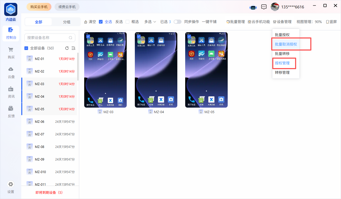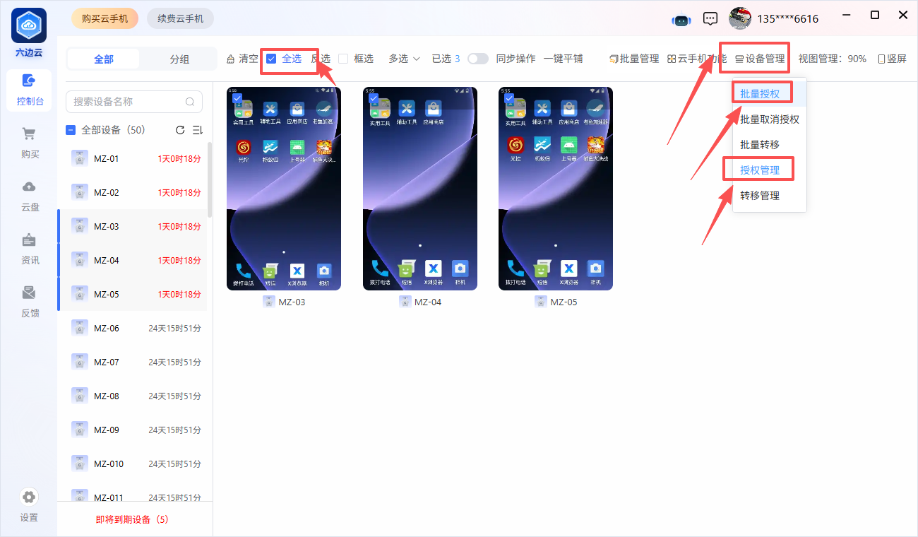 1.选中需要授权的设备,点击点击右上方功能栏里的“设备管理”,点击“授权云手机批量授权”或者“授权管理”