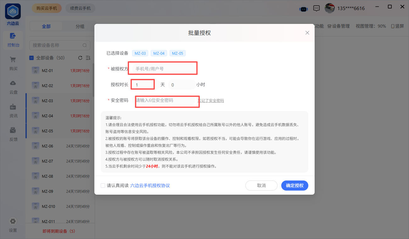 2. 点击授权云手机后,将信息填好,并在右侧选好需要授权的云机,注意授权的云机的剩余时长必须大于24个小时