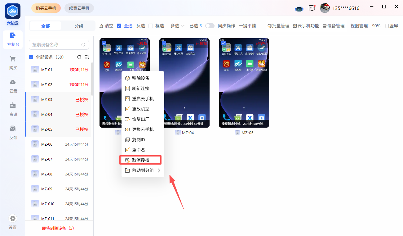 2.单台取消授权:鼠标放置在要取消授权的云机上,点击鼠标右键,点击“取消授权”即可