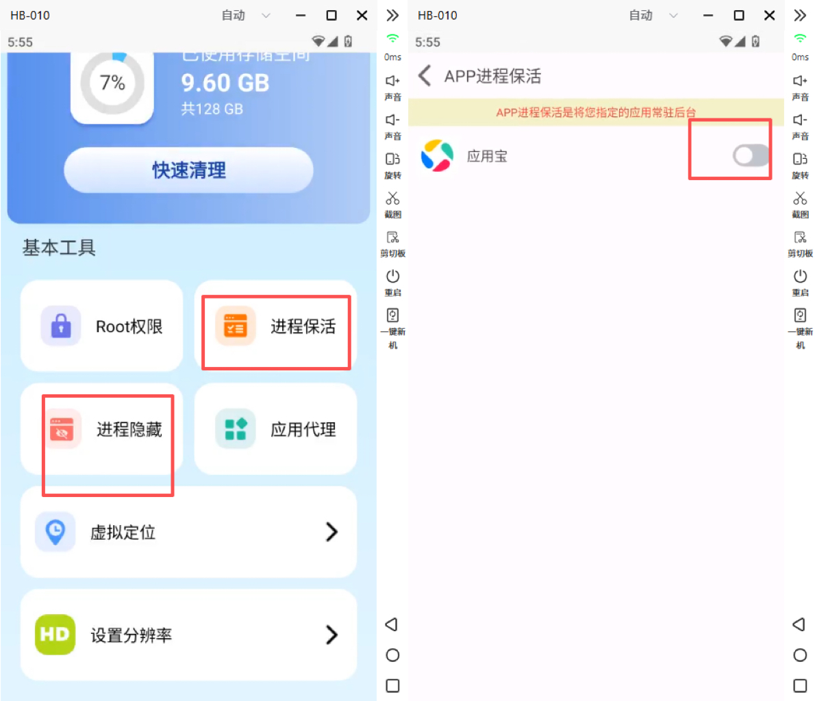 3.点击“进程保活”和“进程隐藏”,选中需要开启的设备就OK了