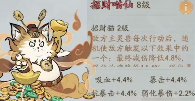 根据官方预告及现有信息,招财喵仙预计定位为辅助/增伤型精怪。其核心技能可能围绕以下几个方面展开: